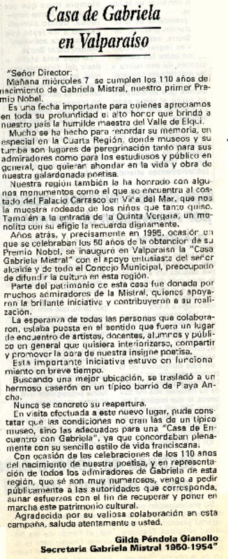 Gilda Péndola, amiga y secretaria de Gabriela (entrevista) [artículo]Gilda Péndola Gianollo.