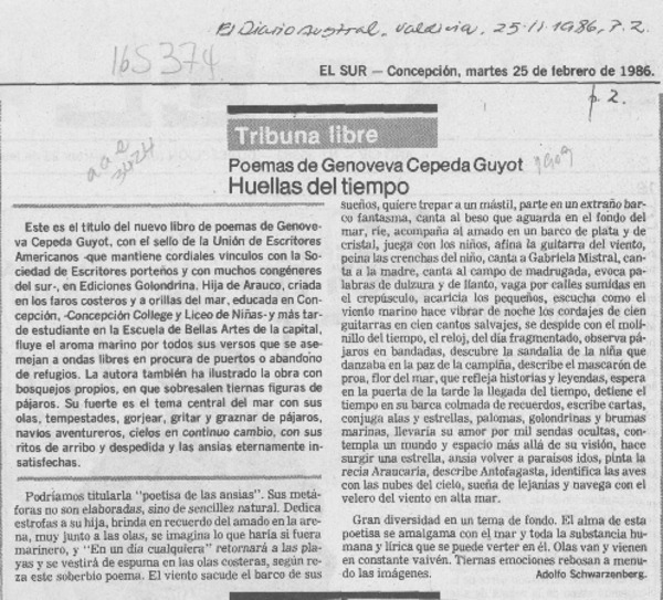 Poemas de Genoveva Cepeda Guyot "Huellas del tiempo" [artículo] Adolfo Schwarzenberg.