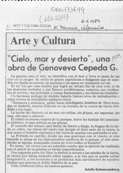 "Cielo, mar y desierto", una obra de Genoveva Cepeda G. [artículo] Adolfo Schwarzenberg.