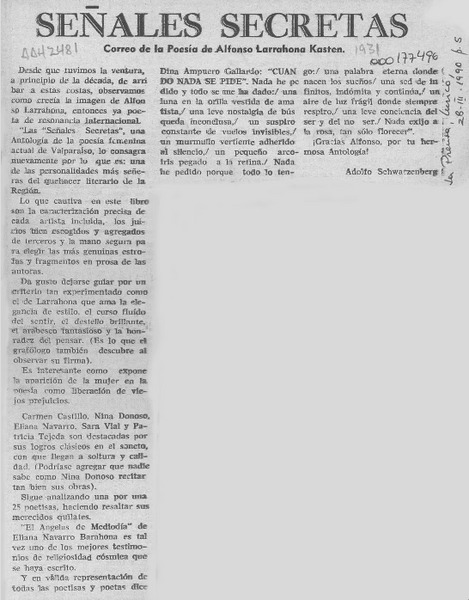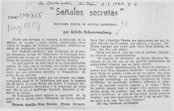 "Señales secretas" [artículo] Adolfo Schwarzenberg.