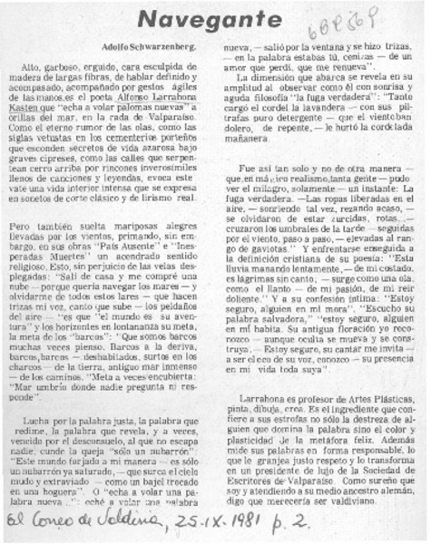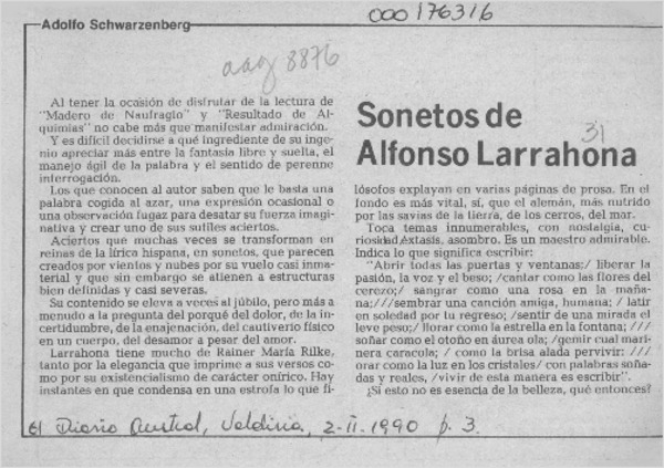 Sonetos de Alfonso Larrahona [artículo] Adolfo Schwarzenberg.