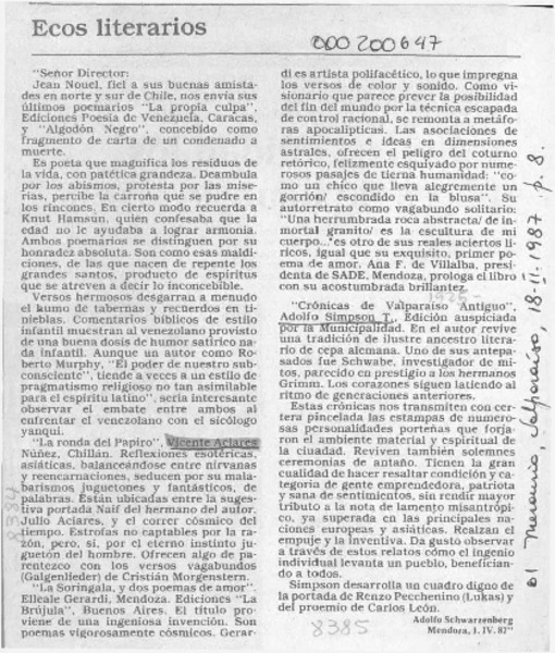 Ecos literarios [artículo] Adolfo Schwarzenberg.