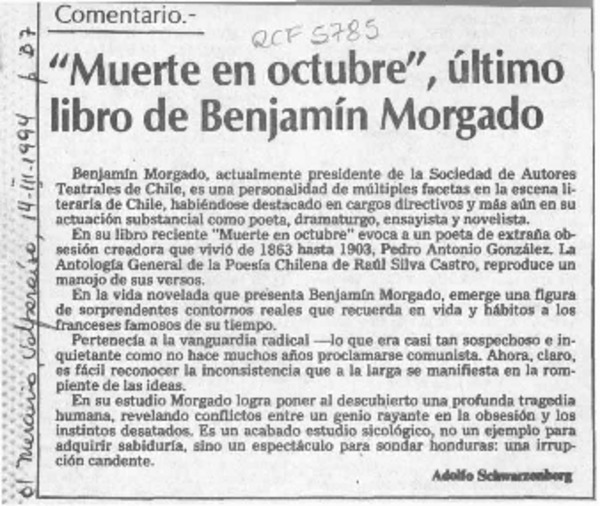 "Muerte en octubre", último libro de Benjamín Morgado [artículo] Adolfo Schwarzenberg.