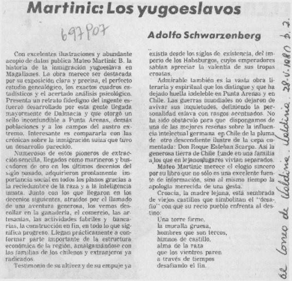 Martinic: los yugoeslavos [artículo] Adolfo Schwarzenberg.