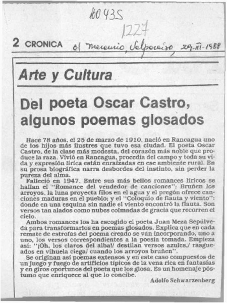 Del poeta Oscar Castro, algunos poemas glosados [artículo] Adolfo Schwarzenberg.