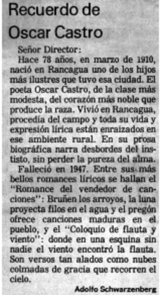 Recuerdo de Oscar Castro [artículo] Adolfo Schwarzenberg.