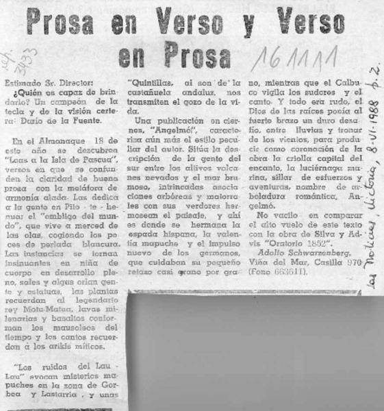 "Prosa en verso y verso en prosa" [artículo] Adolfo Schwarzenberg.