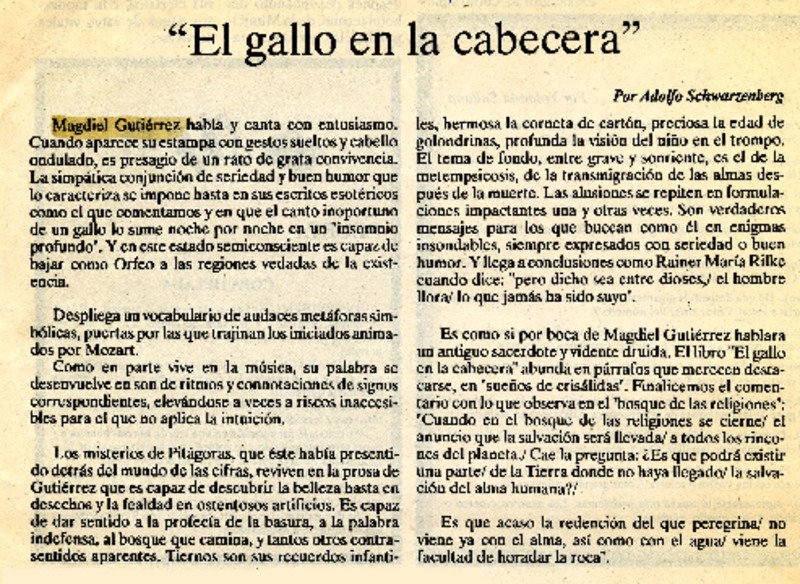 "El gallo en la cabecera" [artículo] Adolfo Schwarzenberg.