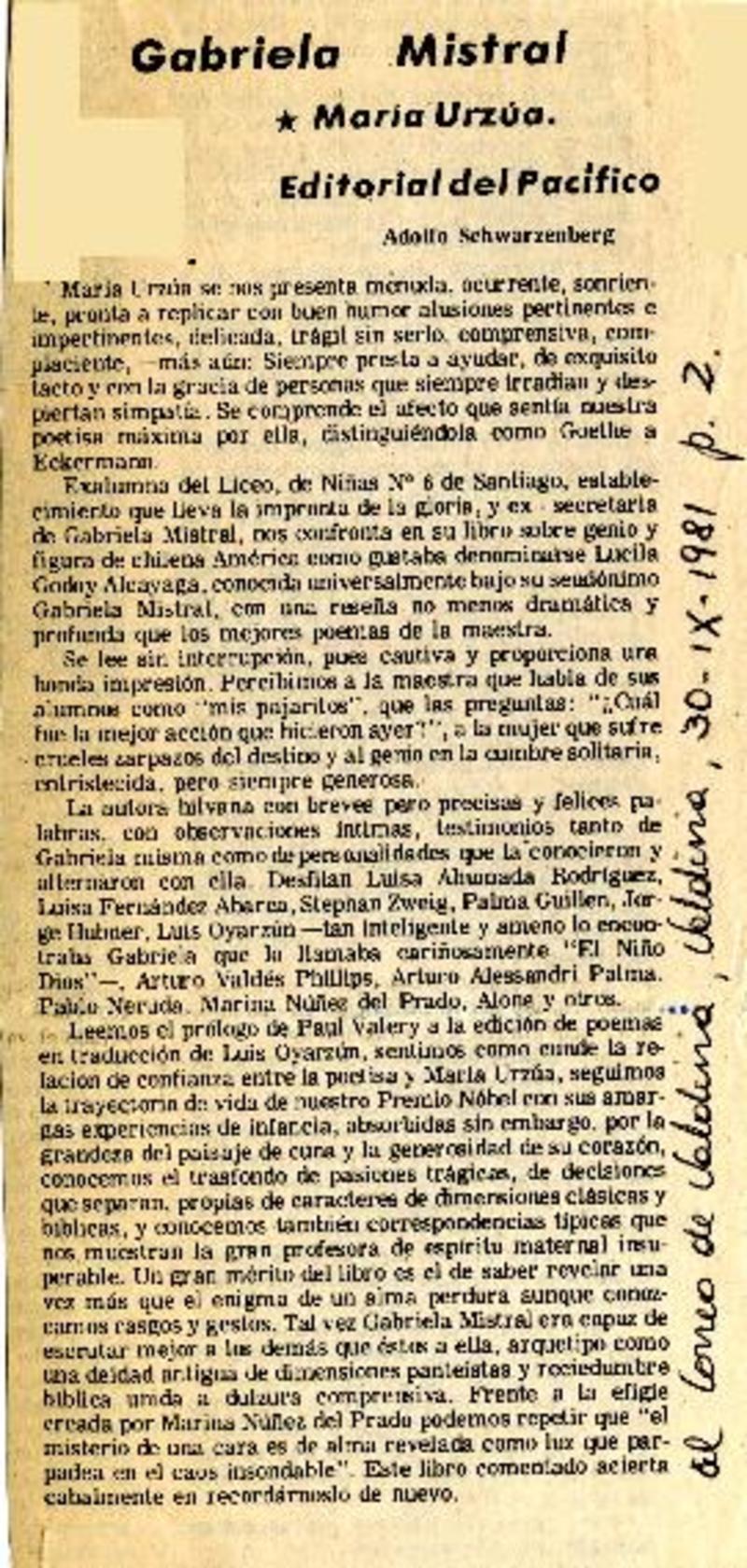Libro sobre Gabriela Mistral [artículo] Adolfo Schwarzenberg.