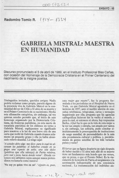 Gabriela Mistral, maestra en humanidad [artículo] Radomiro Tomic R.