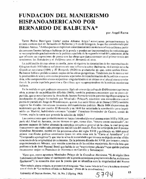 Fundación del manierismo hispanoamericano por Bernardo de Balbuena [artículo] Angel Rama.