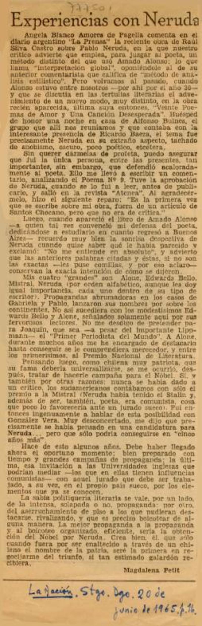 Experiencias con Neruda [artículo] Magdalena Petit.