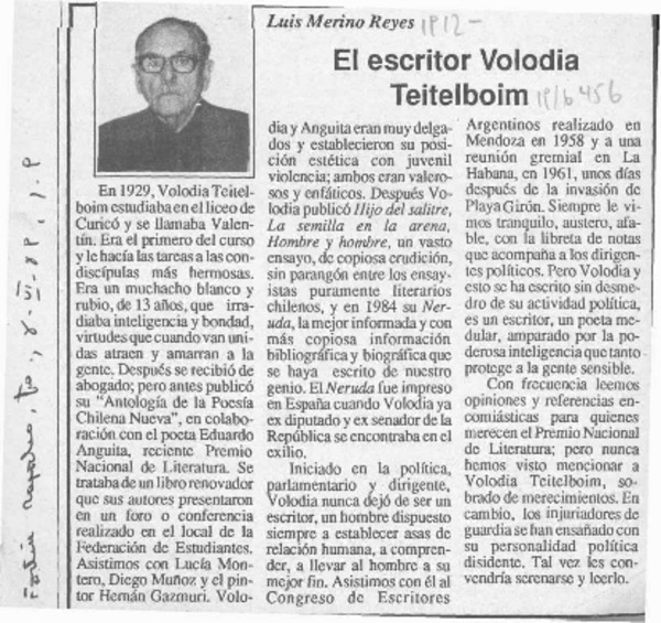 El escritor Volodia Teitelboim [artículo] Luis Merino Reyes.