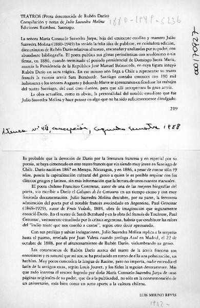Teatros, prosa desconocida de Rubén Darío [artículo] Luis Merino Reyes.
