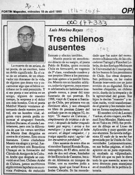 Tres chilenos ausentes [artículo] Luis Merino Reyes.