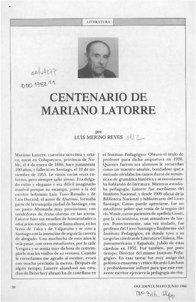 Centenario de Mariano Latorre [artículo] Luis Merino Reyes.