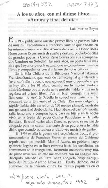 A los 80 años, con mi último libro, "Aurora y final del día" [artículo] Luis Merino Reyes.