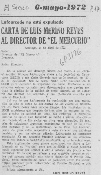Carta de Luis Merino Reyes al director de "El Mercurio" [artículo] Luis Merino Reyes.