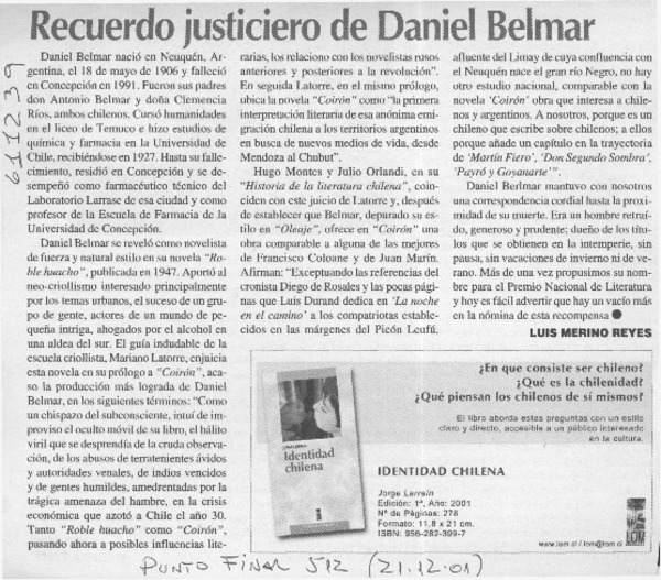 Recuerdo justiciero de Daniel Belmar [artículo] Luis Merino Reyes