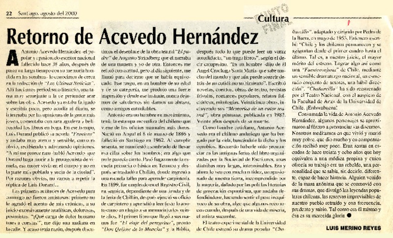 Retorno de Acevedo Hernández [artículo] Luis Merino Reyes