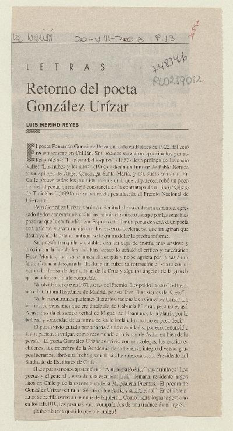 Retorno del poeta González-Urízar [artículo] Luis Merino Reyes.