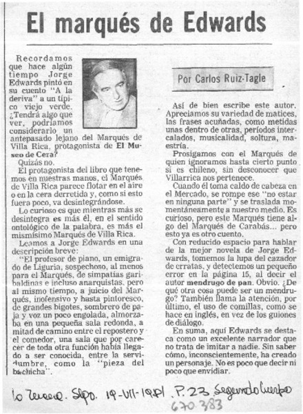 Recuerdo de Edwards Bello [artículo] Carlos Ruiz Tagle.