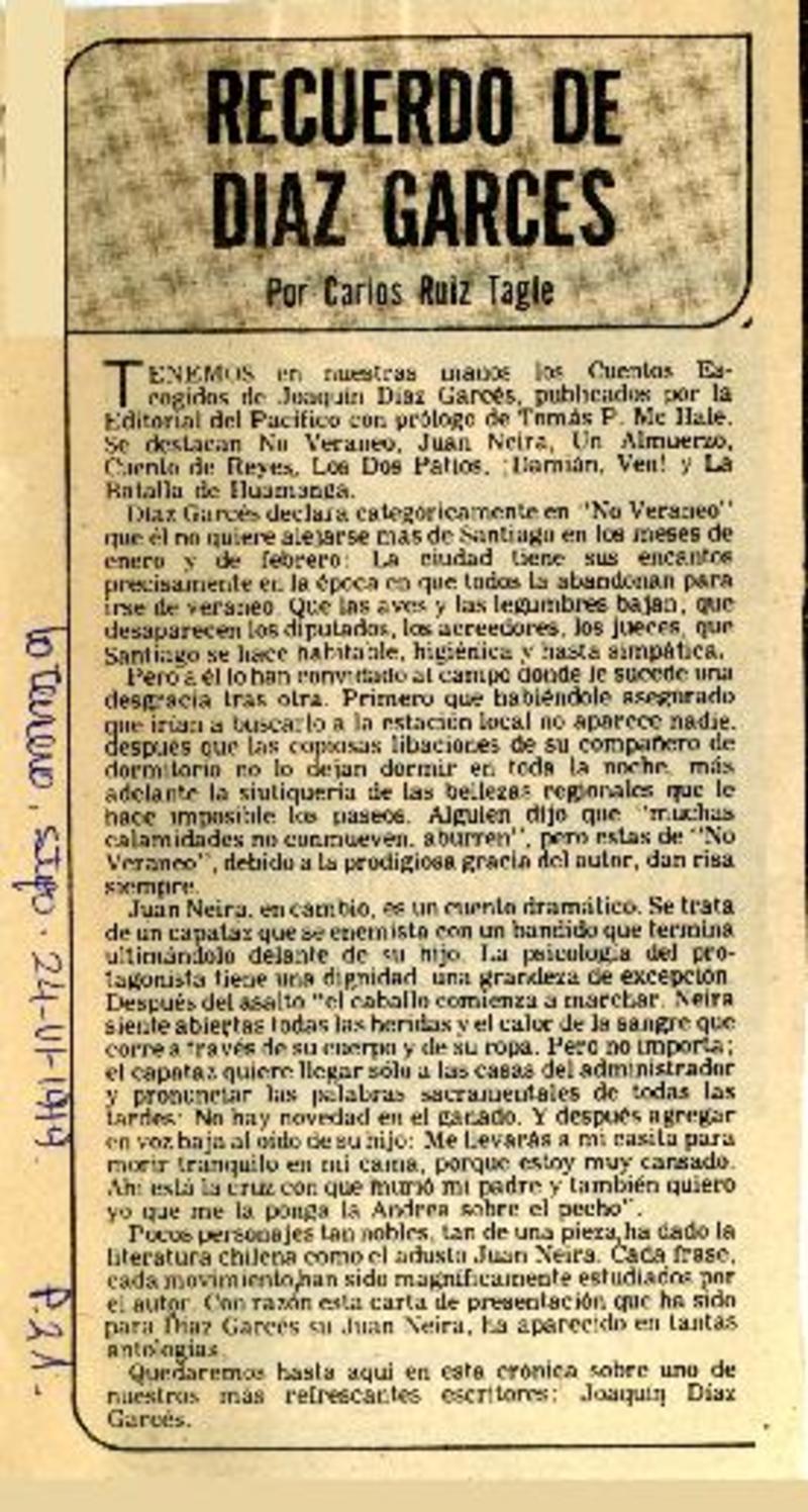 Recuerdo de Díaz Garcés [artículo] Carlos Ruiz-Tagle.