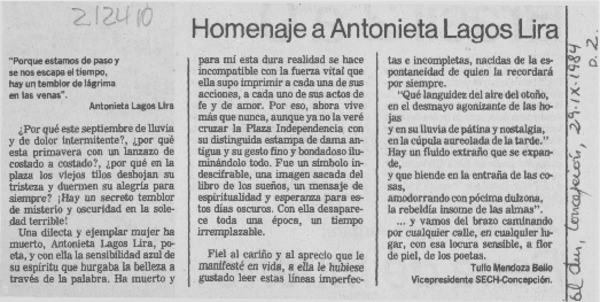 Homenaje a Antonieta Lagos Lira [artículo] Tulio Mendoza Belio.