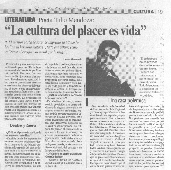 Poeta Tulio Mendoza: "La cultura del placer es vida". (entrevistas) [artículo] Hernán Aravena P.