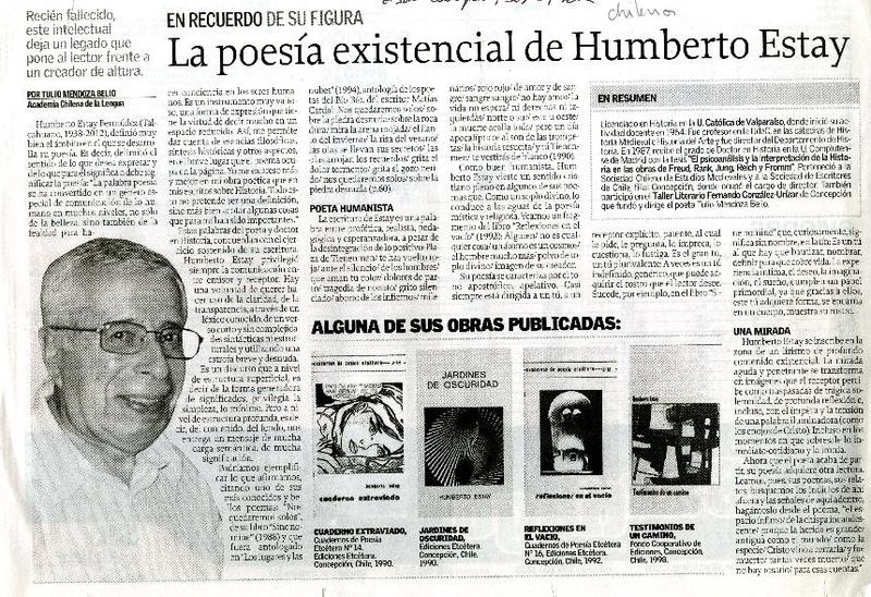 La poesía existencial de Humberto Estay [artículo] Tulio Mendoza Belio.