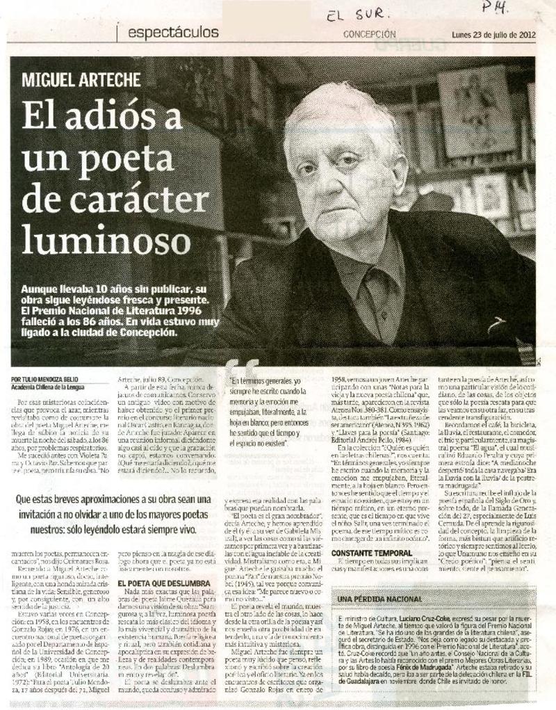 El adiós a un poeta de carácter luminoso [artículo] Tulio Mendoza Belio.