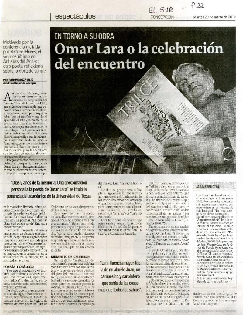 Omar Lara o la celebración del encuentro [artículo] Tulio Mendoza Belio.