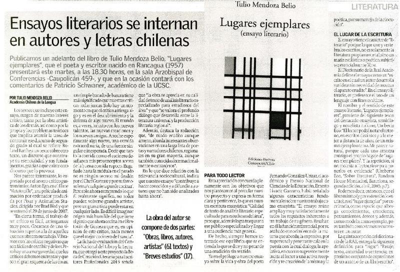 Ensayos literarios se internan en autores y letras chilenas [artículo] Tulio Mendoza Belio.