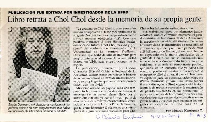 Libro retrata a Chol Chol desde la memoria de su propia gente [artículo]Eduardo Henríquez O.