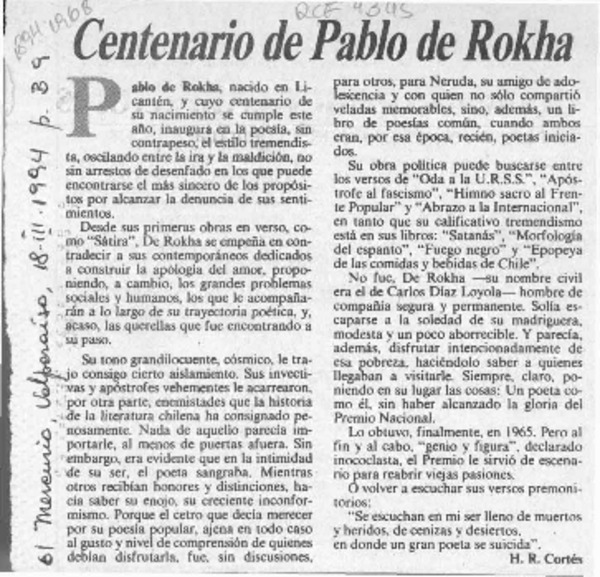 Centenario de Pablo de Rokha [artículo] H. R. Cortés.