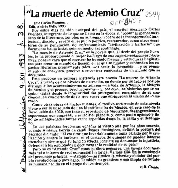 "La muerte de Artemio Cruz" [artículo] H. R. Cortés.