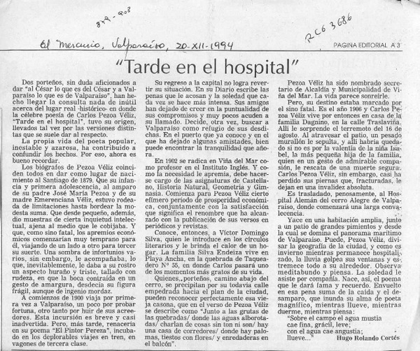 "Tarde en el hospital" [artículo] Hugo Rolando Cortés.