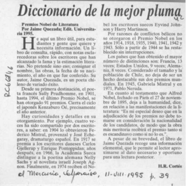 Algo más sobre ese Premio Nobel de Literatura [artículo] Hugo Rolando Cortés.