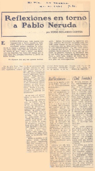 Reflexiones en torno a Pablo Neruda [artículo] Hugo Rolando Cortés.