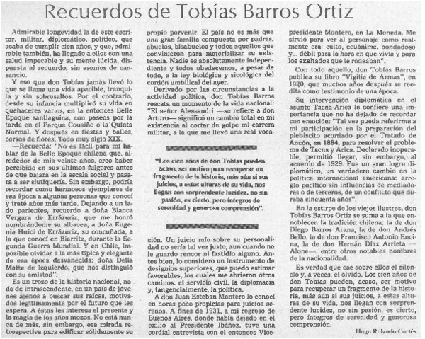 Recuerdos de Tobías Barros Ortiz [artículo] Hugo Rolando Cortés.