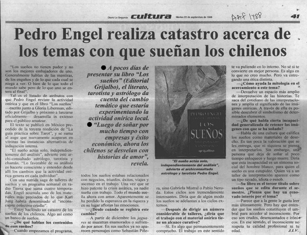 Pedro Engel realiza catastro acerca de los temas con que sueñan los chilenos [artículo] J. I. V.