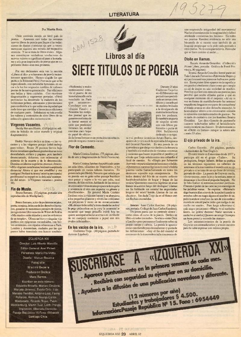 Autoras chilenas - Autores chilenos - Serrano, Bruno - Trejo, Guillermo - Geywitz, Carlos - Ramírez, Juan Carlos - Inocuo - En los vacíos de la ira - El ojo privado de la ira - González, Beatriz Amanda - Otoño en llamas - Jimenez, Maria Cristina - Flor de cemento - Navarro, Heddy - Vírgenes vacantes - Fin de muslo