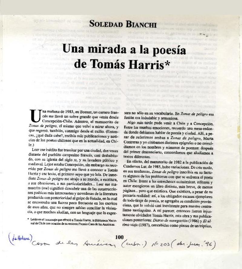 Una mirada a la poesía de Tomás Harris [artículo] Soledad Bianchi.