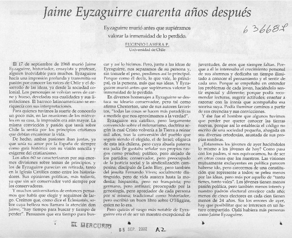 Jaime Eyzaguirre cuarenta años después [artículo] Eugenio Lahera P.