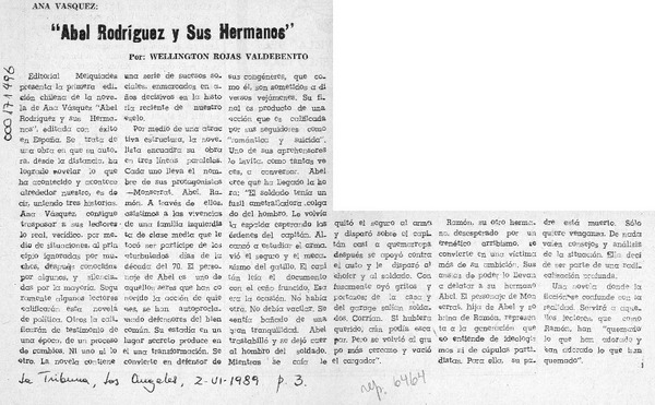 Ana Vásquez, "Abel Rodríguez y sus hermanos" [artículo] Wellington Rojas Valdebenito.