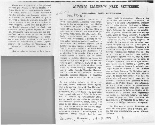 Alfonso Calderón hace recuerdos [artículo] Wellington Rojas Valdebenito.