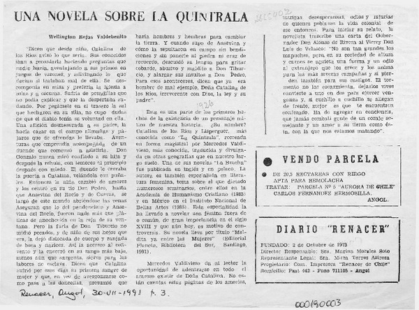 Una novela sobre la Quintrala [artículo] Wellington Rojas Valdebenito.