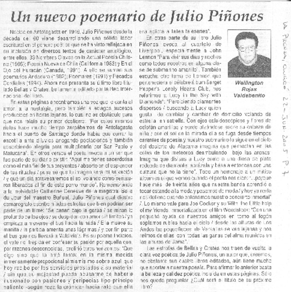 Un nuevo poemario de Julio Piñones [artículo] Wellington Rojas Valdebenito