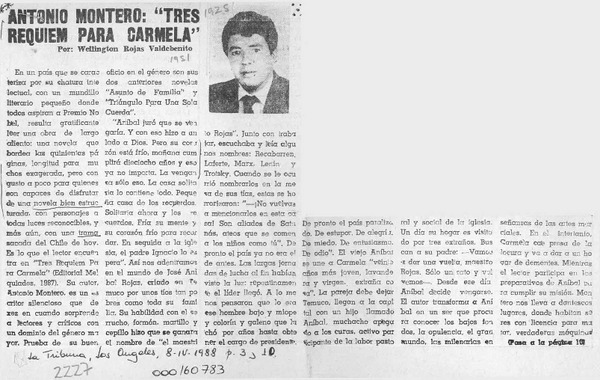 Antonio Montero, "Tres requiem para Carmela" [artículo] Wellington Rojas Valdebenito.