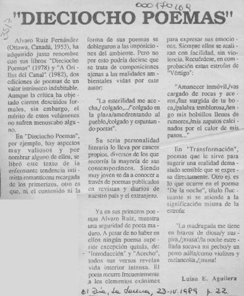 "Dieciocho poemas" [artículo] Luis E. Aguilera.